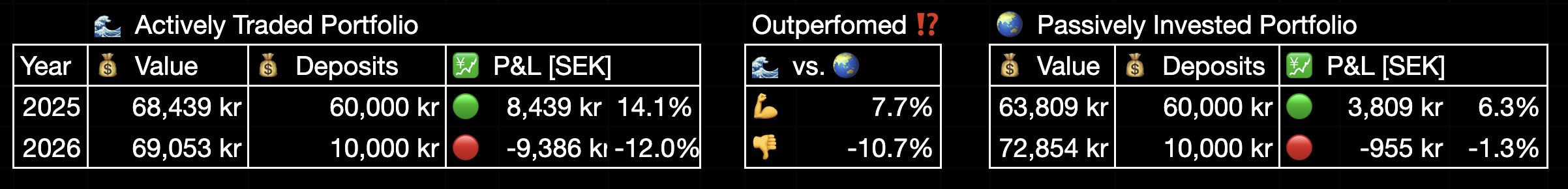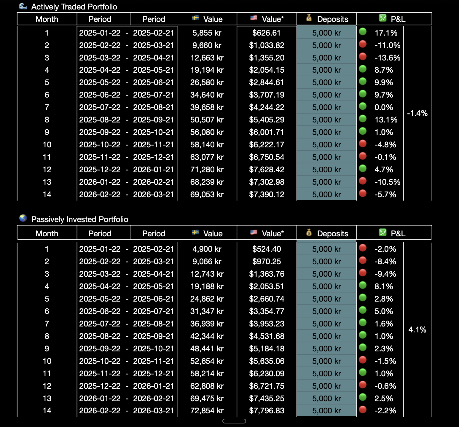 - 💰 10,000 SEK (~$1,000) invested monthly - split 50/50