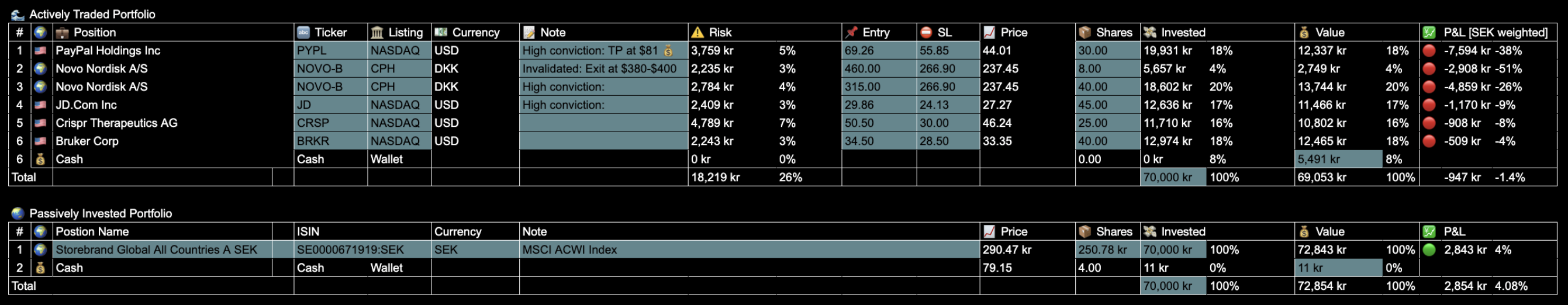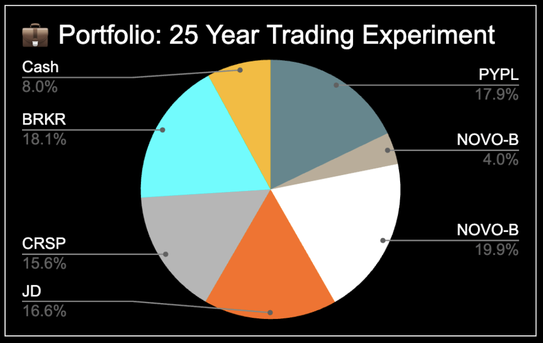 The portfolio currently consists of six open trades: $PYPL, $NOVO-B (x2), $JD, $CRSP, and $BRKR, with 8.0% in cash.