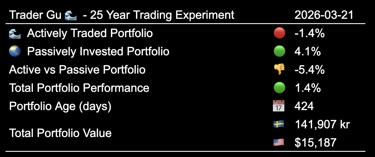 The total portfolio value is now worth $15,187. The actively traded portfolio has dipped into negative territory for the first time since the early months, while the passively invested portfolio remains positive.