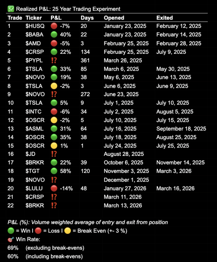 But these two months haven’t been all bad. The $TGT trade closed for a +58% gain after 120 days - one of the best single trades in the experiment so far. Two new positions have been opened in $CRSP and $BRKR, and the process continues with the long-term growth trajectory as the main goal.