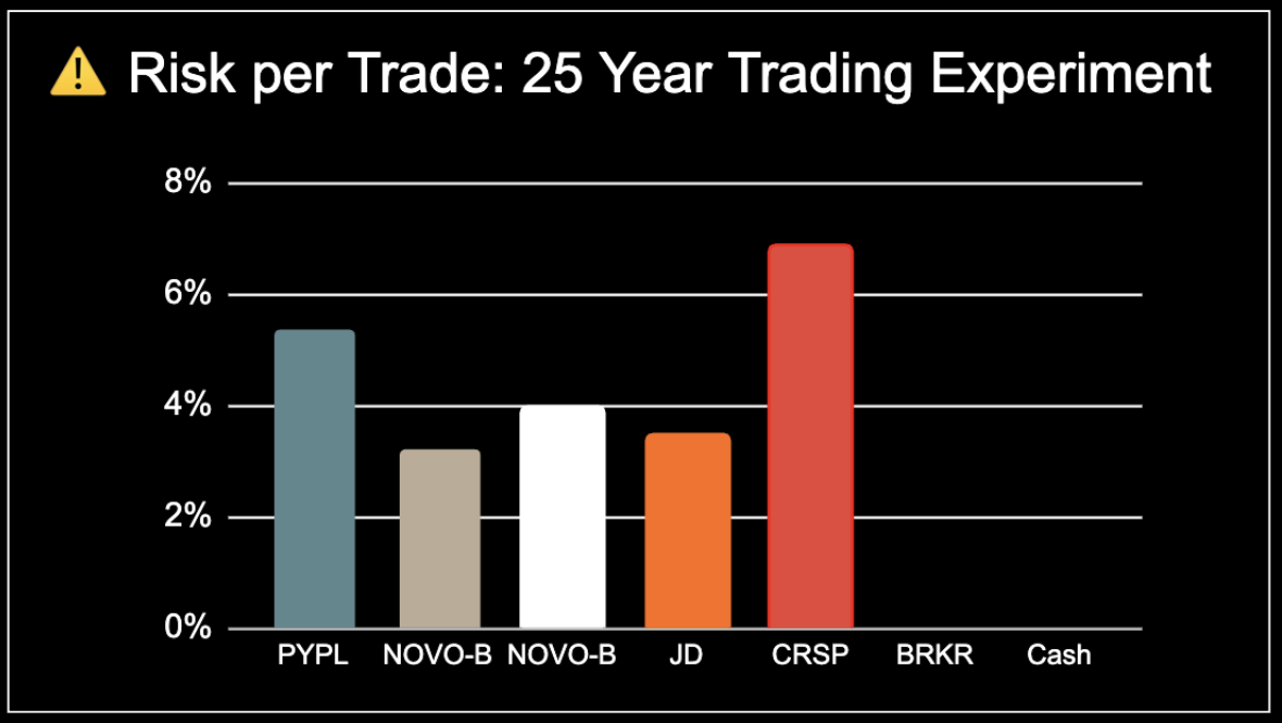 The total invested capital at risk remains elevated. $CRSP carries the highest individual risk, while $PYPL continues to be a drag on the portfolio from the gap below my stop loss last month.