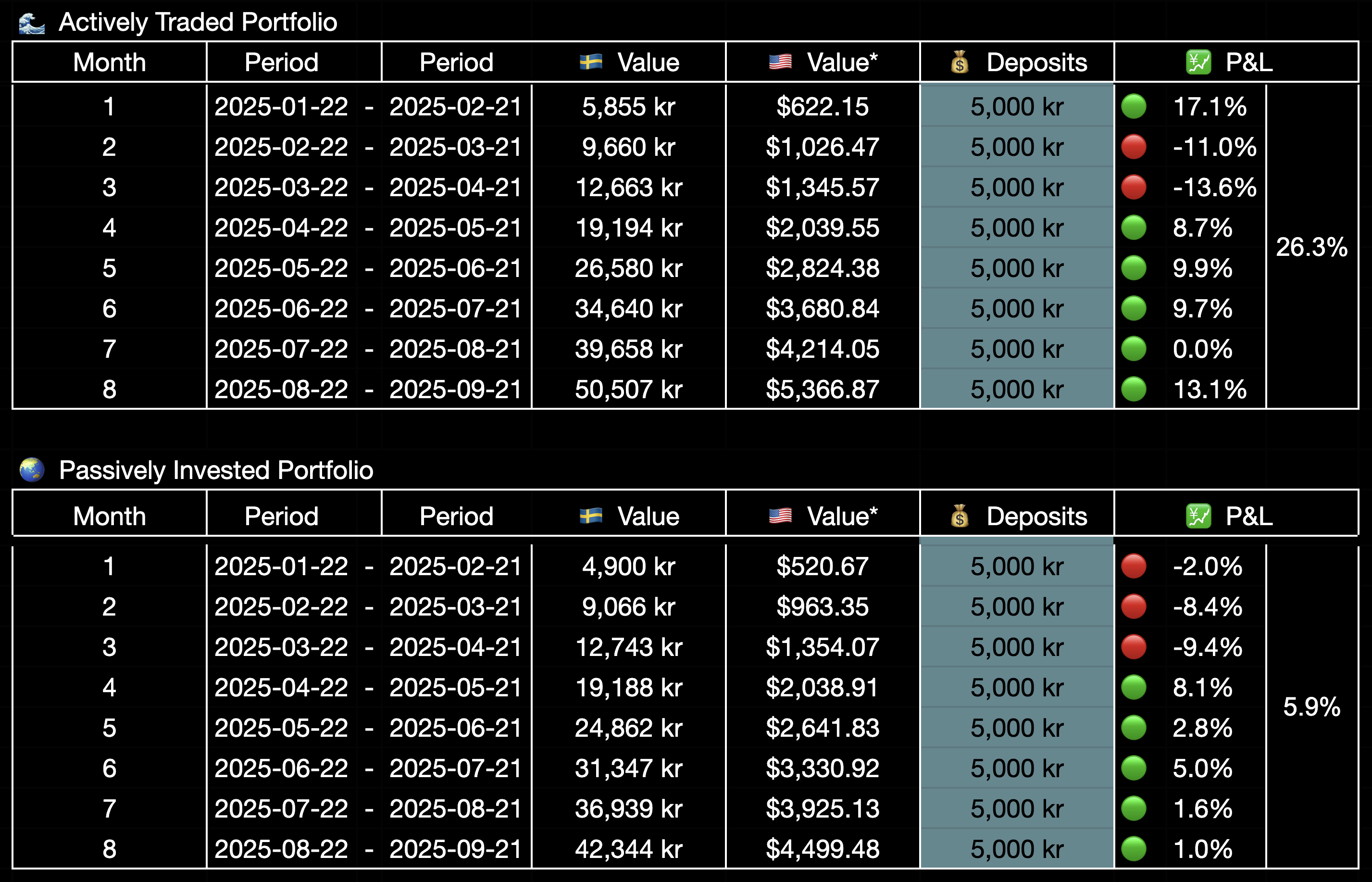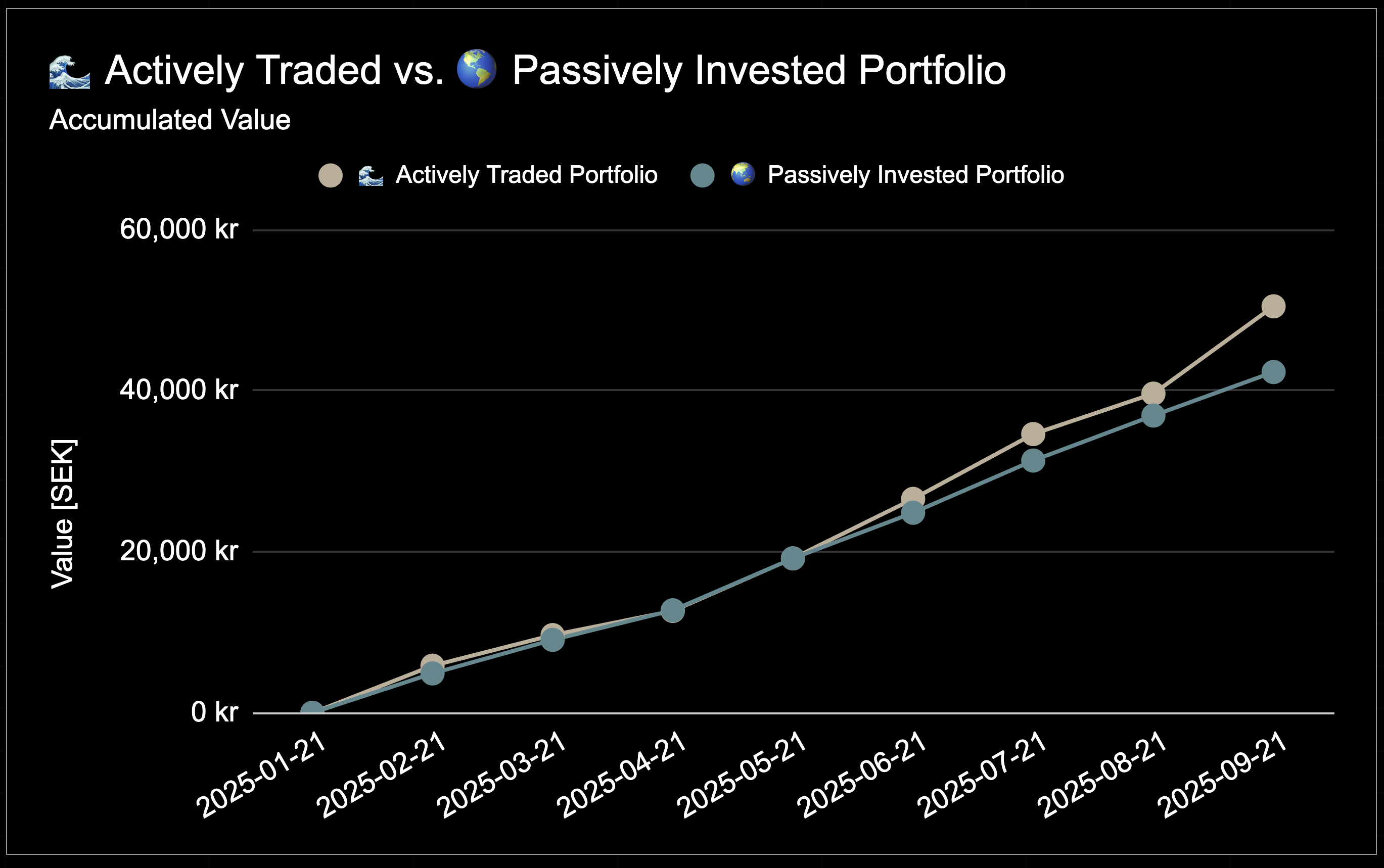 - 💰 10,000 SEK (~$1000) invested monthly - split 50/50