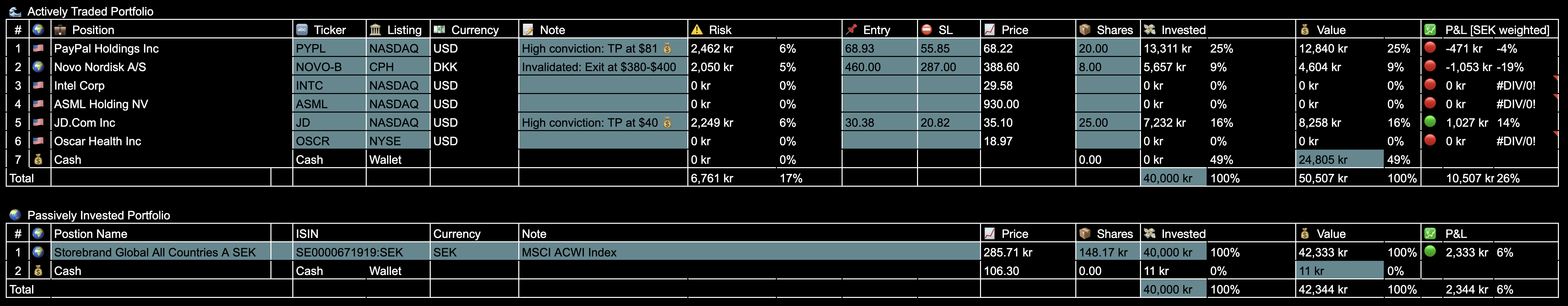 The Actively Traded Portfolio performance has been flat due to a significant drawdown on my new $NOVO trade, whereas the Passively Invested Portfolio has outperformed with a total of 1.6% gain.