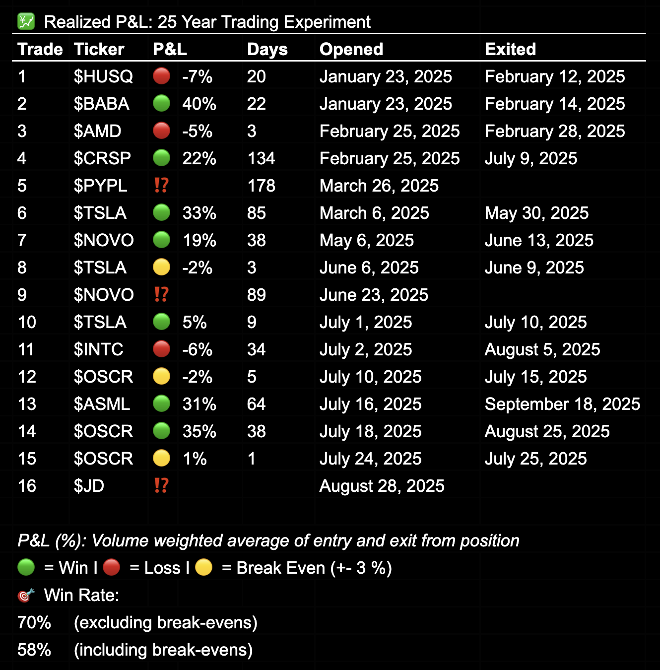 This translates to a 70% win rate when excluding break-even trades, or 58% including them. The top three trades percentage-wise have been $BABA, $TSLA $OSCR, each delivering between 31% and 40% from entry to exit. Losses have been modest, with a maximum realized loss of just 7.2%.