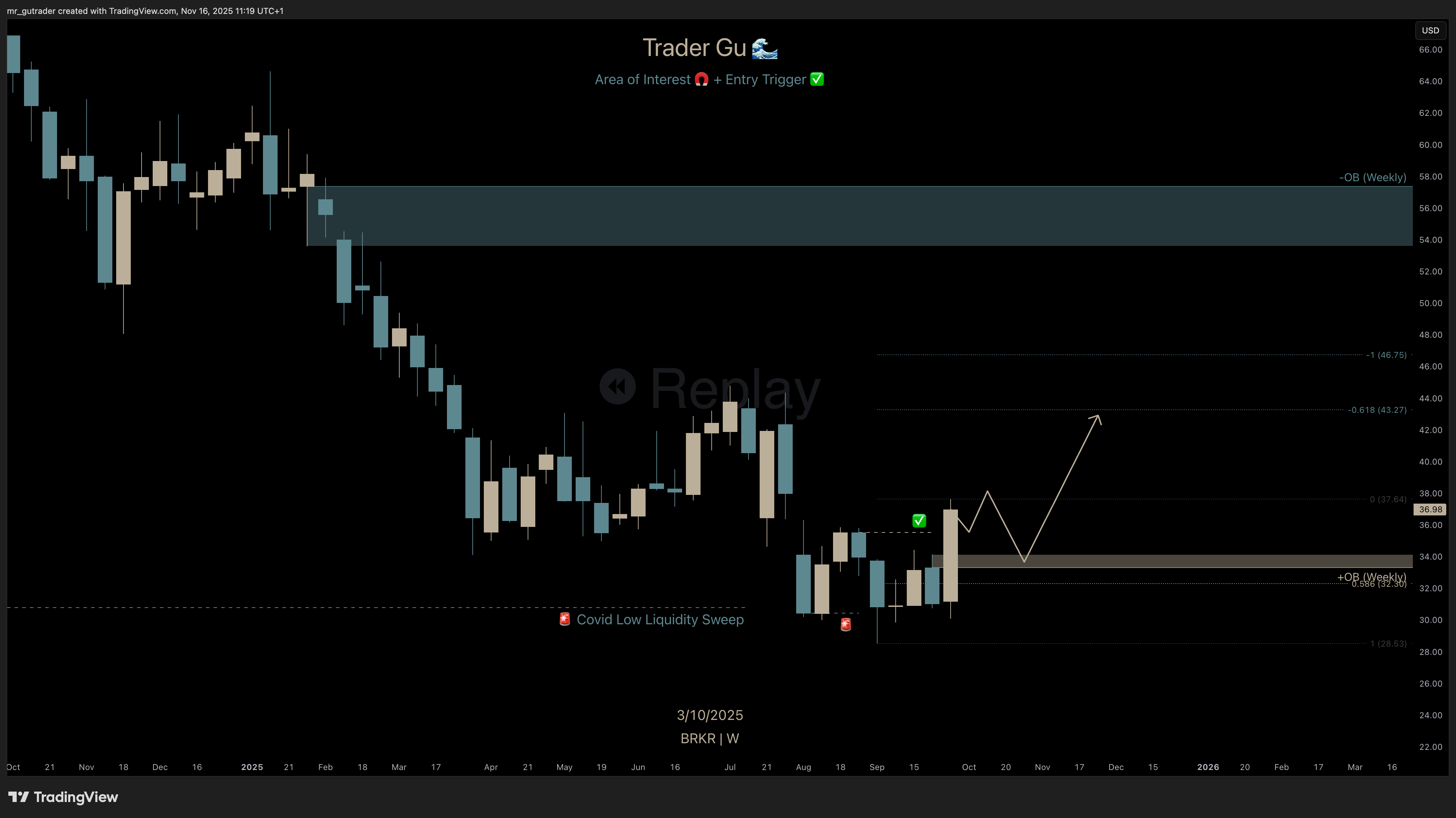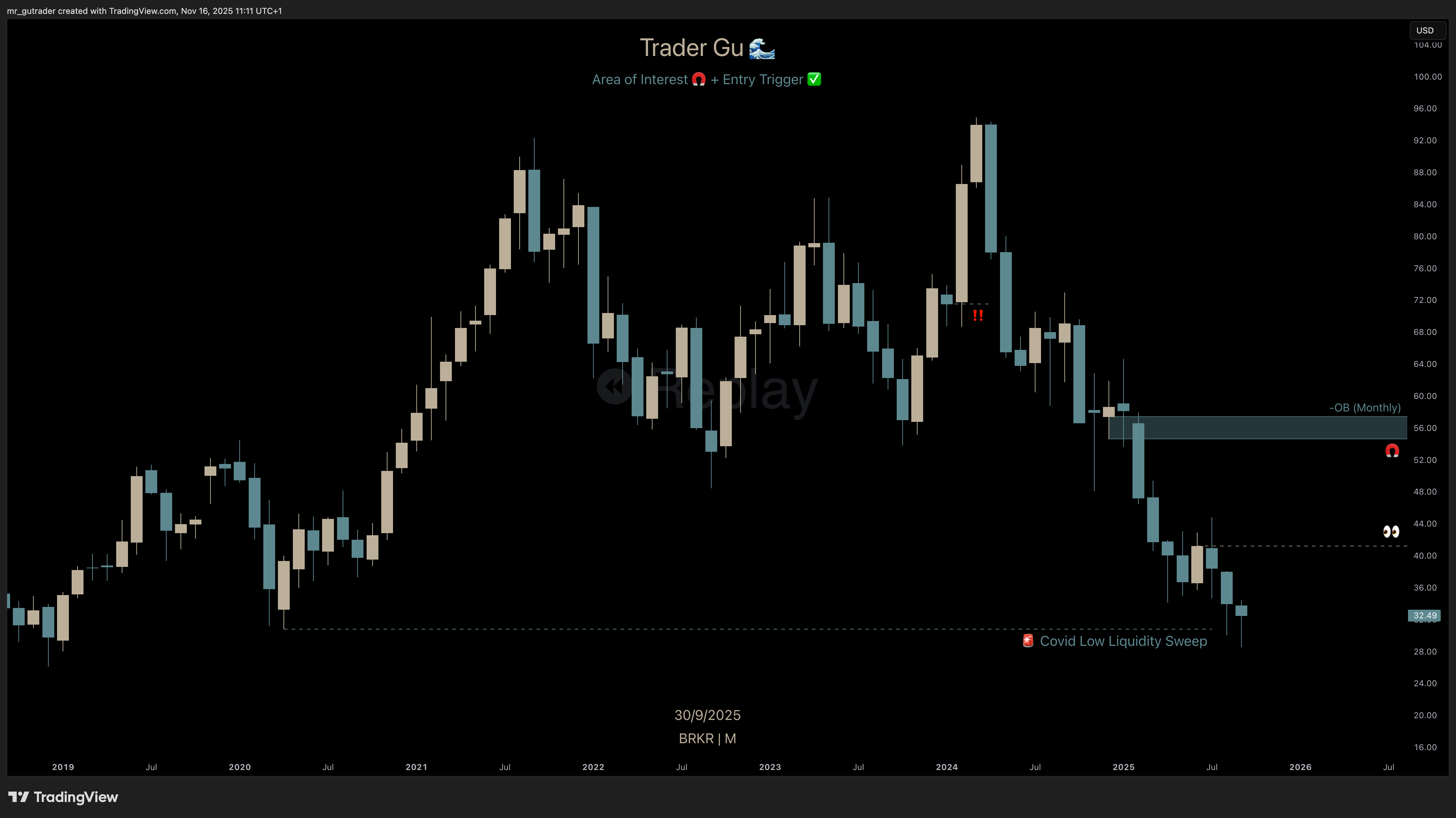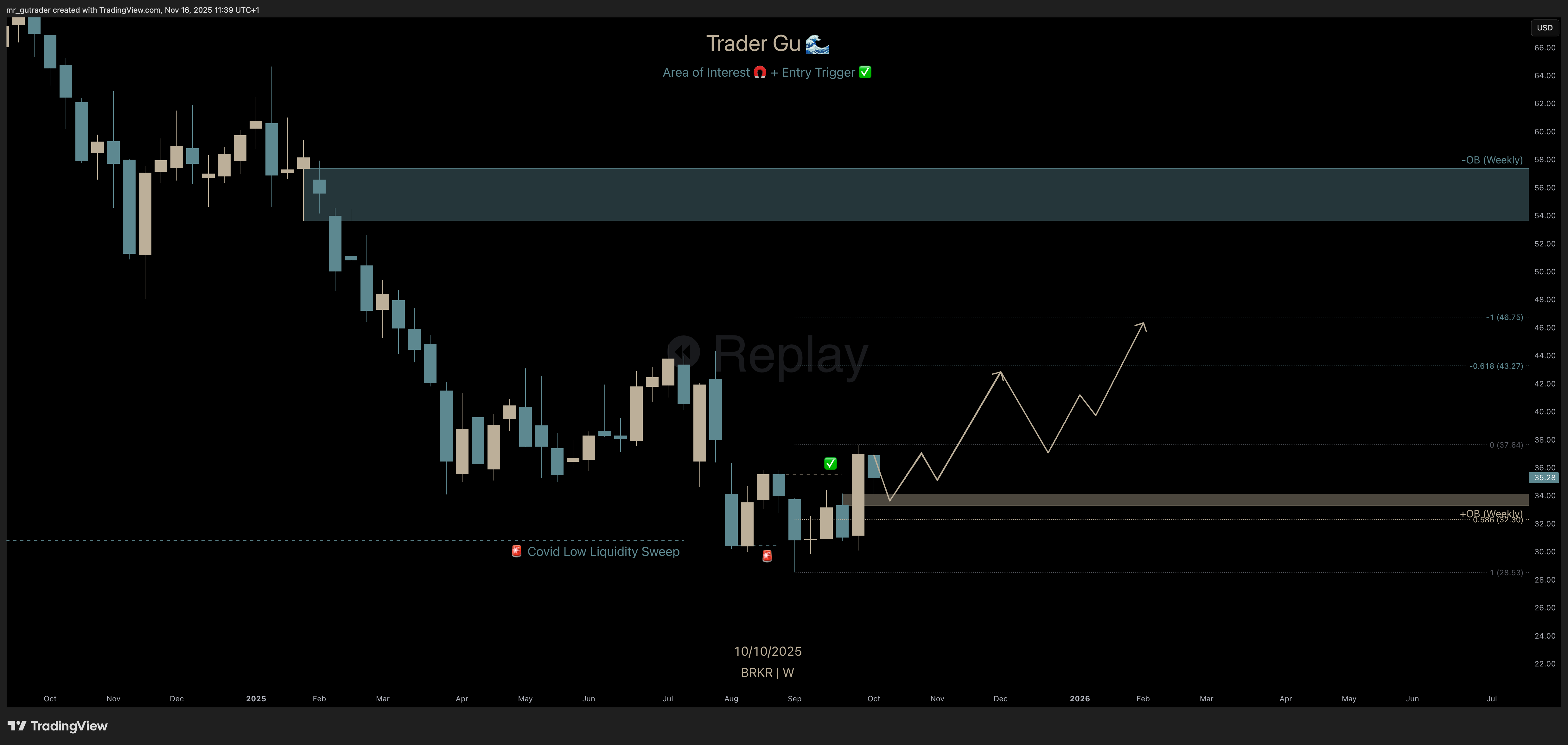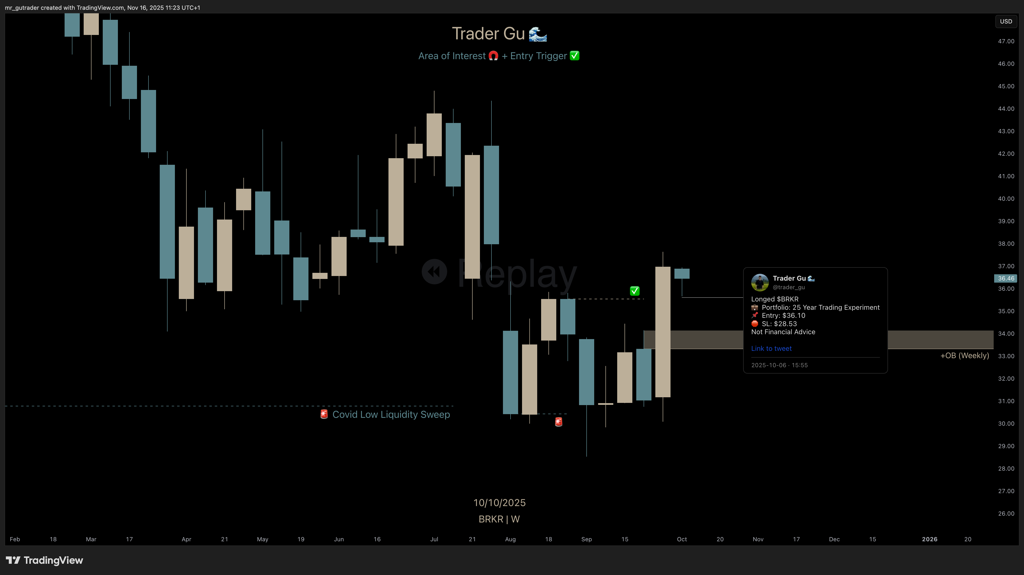 Bruker Corp. $BRKR was unknown to me until I first saw it in my X-feed two months ago. It caught my attention after noticing we had a Covid low-liquidity sweep followed by the build-up of a high-conviction trigger. I decided to enter a large position, and in this post I am walking through my thought process of a trade that realized a 22% gain on position for my 25 Year Trading Experiment portfolio.